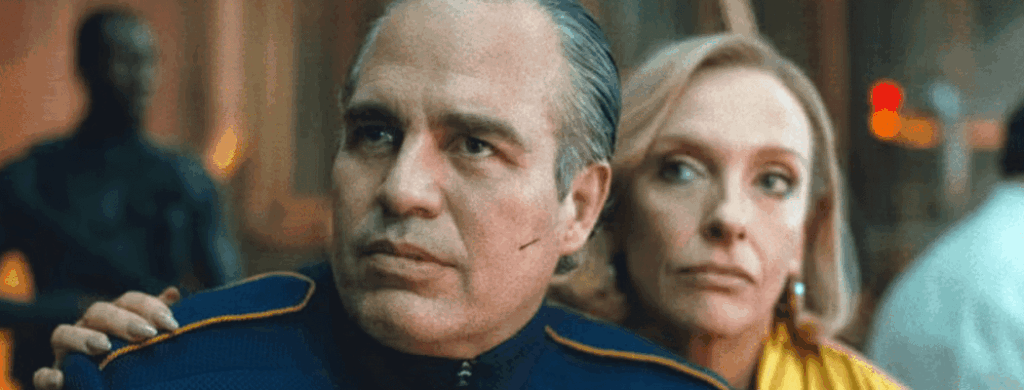 O subtelnej grze nie można mówić w odniesieniu do Marka Ruffalo, który wciela się w pełnego biurokratycznego chłodu i arogancji dyrektora misji kolonizacyjnej, Kennetha Marshalla. Jego postać jest mocno przerysowana, wręcz groteskowa i stanowiąca solidny kontrast wobec introwertycznego Mickey’ego 17. Dyrektor określa wymienialnego „zakichanym wydrukiem”, „mięsną matrycą”, „mielonką z odzysku”, udowadniając, że to nie sposób przyjścia na świat decyduje o naszym człowieczeństwie. Marshalla, z jego technokratycznymi manierami, narcyzmem i skłonnościami do manipulacji świetnie uzupełnia żona, Ylfa (Toni Collette). „Nie zrób mi dziury w dywanie!” – krzyczy, gdy Marshall przykłada broń do głowy Mickey’ego. Trzeba przyznać, że to naprawdę mocny duet, który paradoksalnie uosabia cały ten system i jednocześnie stanowi jego największe zagrożenie. Wprowadza też sporą dawkę czarnego humoru, a w tej stylistyce Joon-ho Bong czuje się najlepiej. Jest jeszcze Steven Yeun jako Timo, który wnosi do filmu charyzmę i energię. To postać tajemnicza i niejednoznaczna. Yeun nie dostaje za dużo ekranowego czasu, wystarczająco jednak, by zaintrygować widza i zasiać ziarno moralnego niepokoju.