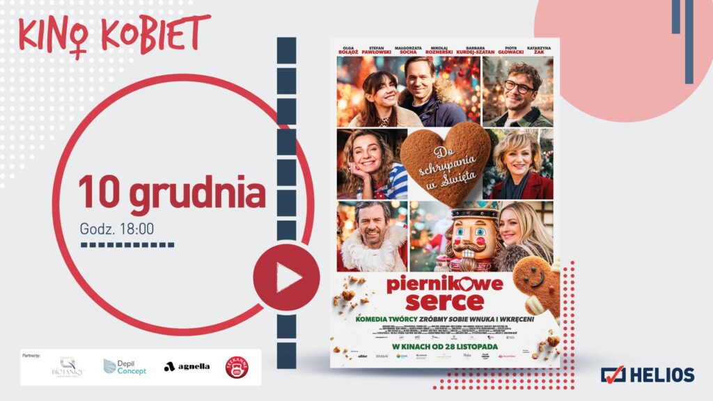 W grudniowym repertuarze Heliosa nie może zabraknąć cyklu Kino Kobiet! W ramach jego najbliższej odsłony, zaplanowanej na środę, 10 grudnia, zostanie wyświetlona polska komedia romantyczna „Piernikowe serce” – ciepła, świąteczna opowieść w gwiazdorskiej obsadzie.